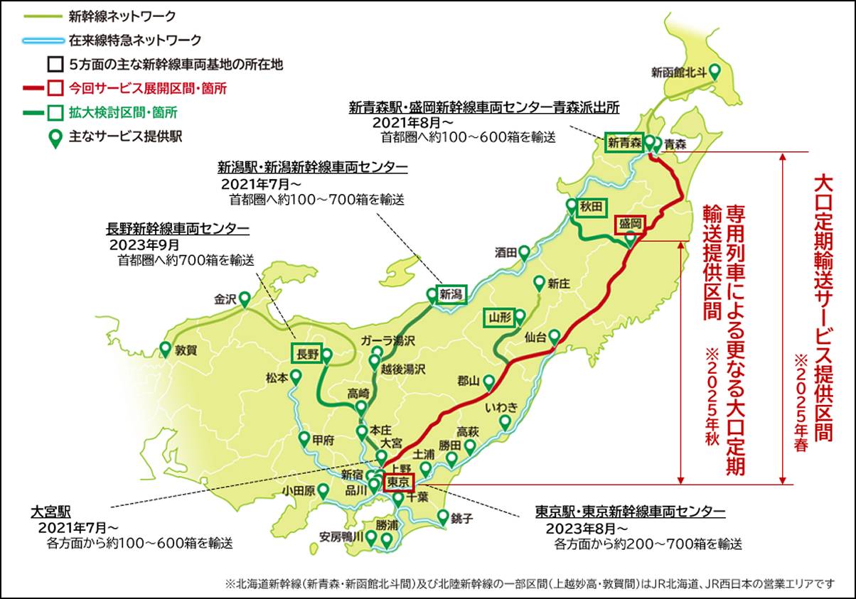 JR東日本は「これまで、主に始発終着駅間かつ列車限定での輸送を行っていましたが、今後、途中駅での取り扱いも含め新幹線全列車に対象を拡大し、大口輸送に関しては東北エリアから首都圏へ土休日を除く毎日輸送を行います。また秋田・山形・上越新幹線など各方面、そして特急電車等を含め『はこビュン』ネットワークを拡大し、輸送サービスを展開します」とし、荷物輸送の大規模な拡大を図る方針だ。