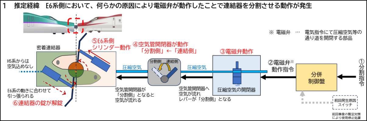 JR東日本が3月11日に発表したところによると、トラブル発生直後の「こまち21号」(E6系)の車両点検で、連結器が分割する動作を繰り返す状態が確認された。このことから併結走行中に何らかの電気的な異常が発生したものと考えているという。