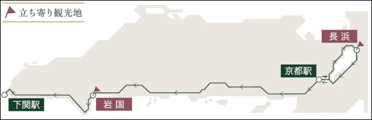 新コースは「びわ湖周遊・せとうちコース」の上下計2コースで、いずれも1泊2日。従来の山陽2コースに琵琶湖周遊を追加する形になる。下りは京都駅を出発して湖西線・北陸本線経由で琵琶湖を周遊し、その後は東海道・山陽本経由で下関駅に到着する。立ち寄り観光地は北陸本線の長浜駅と山陽本線の岩国駅。