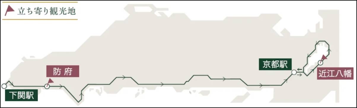 上りは下関駅を出発して山陽・東海道本線を経由。さらに東海道本線と北陸本線、湖西線を経由して琵琶湖を周遊し、京都駅に到着する。立ち寄り観光地は山陽本線の防府駅と東海道本線の近江八幡駅。