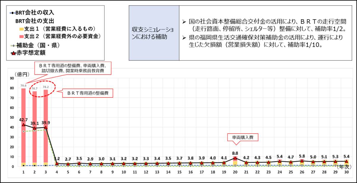 シミュレーションでは事業開始の1年目から3年目まで専用道の工事などのため大規模な投資が必要になり、赤字額も毎年39~42億円程度に。BRT運行開始の4年目は3億2000万円の赤字で、30年目は5億4000万円の赤字になるとしている。