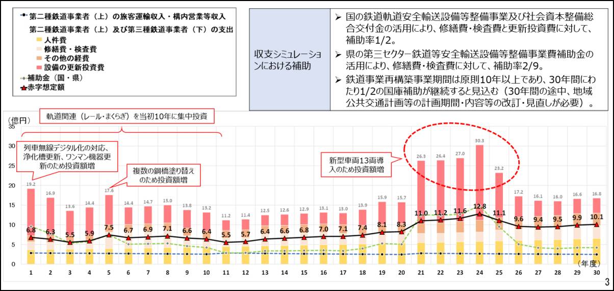 上下分離案は線路施設を保有、管理する第3種鉄道事業者と列車の運行・営業を行う第2種鉄道事業者に分離する完全分離型でシミュレーションを実施。施設の健全化対策を優先的に実施する場合、1年目は6億8000万円の赤字の見込みで、その後も毎年5~8億円程度の赤字が続く。21年目から25年目にかけては新型車両(13両)の導入で毎年11~12億円程度の赤字に。26年目以降は毎年9億円台の赤字が続き、30年目は10億1000万円の赤字になるとした。