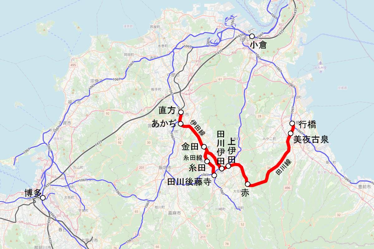 平成筑豊鉄道が運営する伊田線・金田線・田川線のルート。【画像:OpenRailwayMap/OpenStreetMap、加工:鉄道プレスネット】