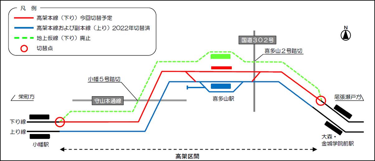 この高架化は国道302号・都市計画道路守山本通線と名鉄瀬戸線を立体交差化する国土交通省・名古屋市の事業。事業区間は小幡~喜多山~大森・金城学院前の2.1kmのうち守山区小幡南2丁目~大森2丁目の約1.9kmになる。2000年3月の事業認可と2006年の工事協定締結を経て工事に着手した。2022年3月に上り線が高架化されており、踏切9カ所のうち1カ所が除却済み。残る8カ所が今回の下り線の高架化で解消される。