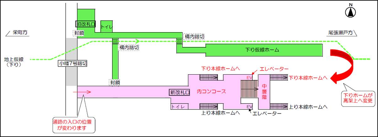下り線の改札口や連絡通路の変更点。【画像:名鉄】