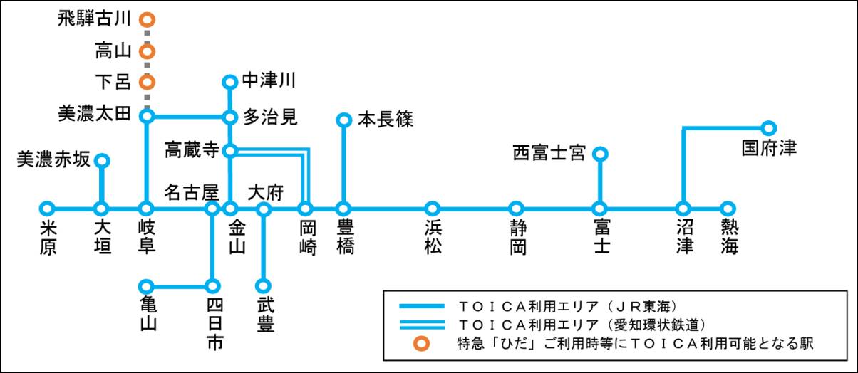 JR東海は7月16日、同社の交通系ICカード「TOICA」について、10月1日から利用エリアを高山本線の高山・飛騨古川方面へ拡大すると発表した。同時に同線の特急「ひだ」でチケットレス乗車サービスを開始する。