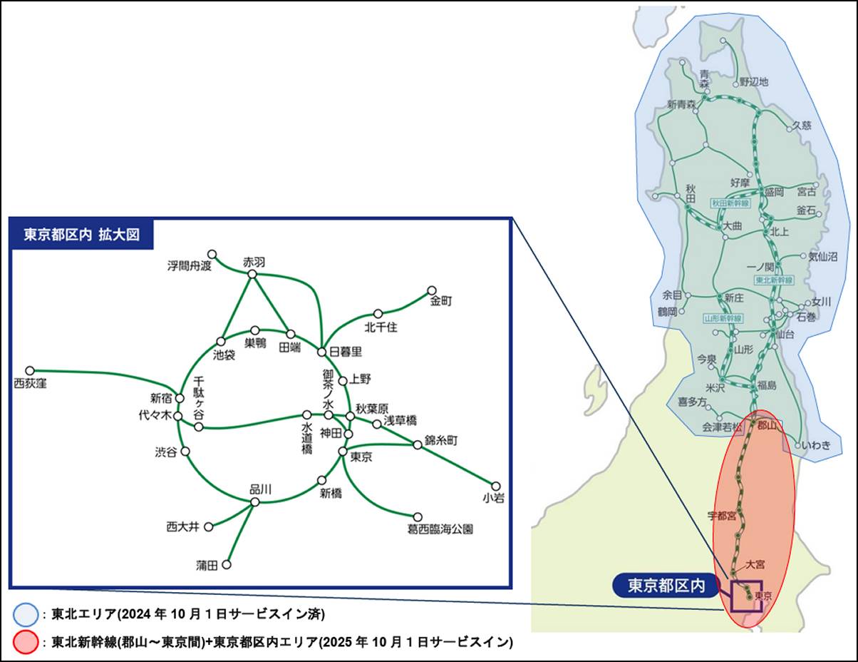 えきねっとQチケの現在のエリアは、いわき・郡山・会津若松・喜多方・鶴岡の各駅より北寄りの東北エリア。10月1日からは新たに東北新幹線・東京~郡山の各駅と山手線などを含む東京都区内エリアがサービスエリアになる。JR東日本の全国交通系ICカード「Suica」のエリア外や自動改札機がない駅から利用することもできる。
