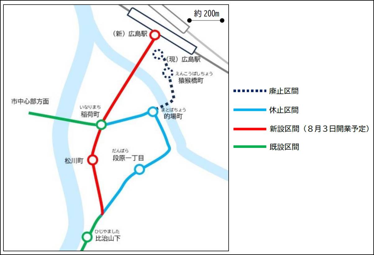 休廃止する線区に乗り入れている既存の運行系統は、今年2025年8月3日に開業する駅前大橋ルート経由に変更。休止区間は改良のうえ2026年春に営業を再開する予定で、広電本社前~紙屋町東~稲荷町~的場町~皆実町六丁目~広電本社前に新設される循環ルートの系統が乗り入れる。