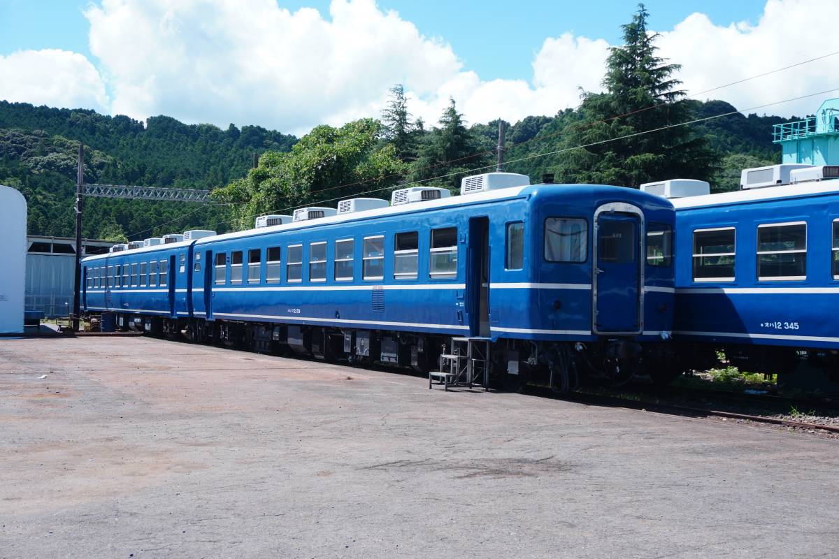 大井川鉄道が今回譲り受けた12系は、スハフ12形2両(スハフ12 129・155)とオハ12形3両(オハ12 341・345・346)。いずれも外観は青をベースに白い帯を巻いた「ブルートレイン塗装」で、製造当初から冷房装置が搭載されている。