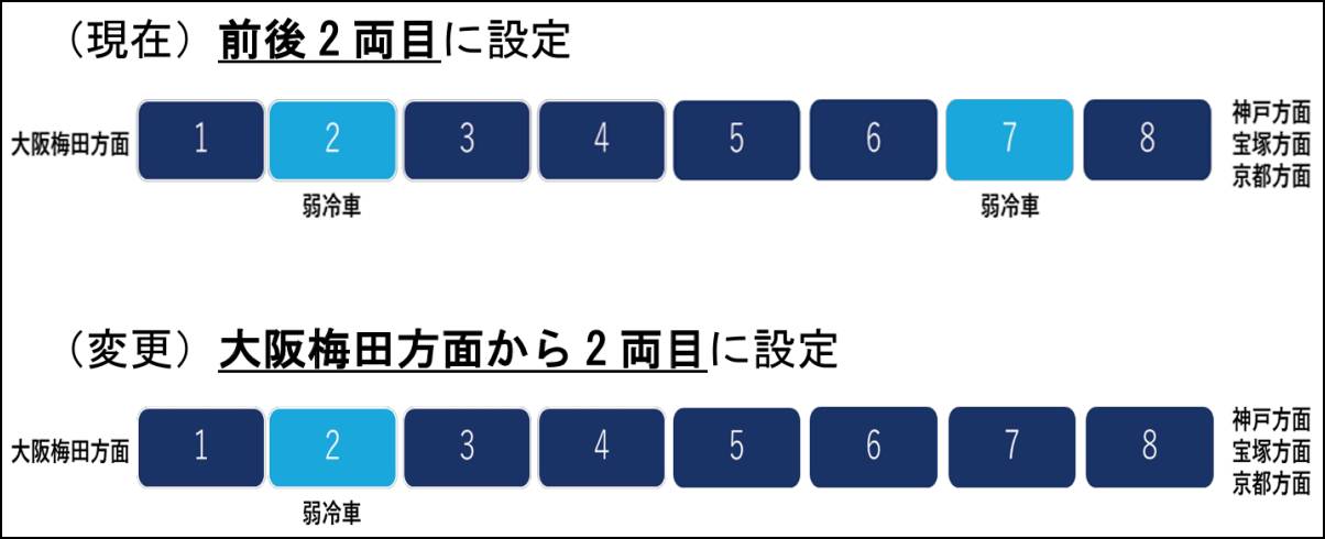 弱冷房車を減らすのは7両編成と8両編成の列車。現在は前後2両目に弱冷房車を設定しており合計2両だが、8月4日以降は順次、弱冷房車の設定を1両(大阪梅田寄りの2両目)だけに変更する。