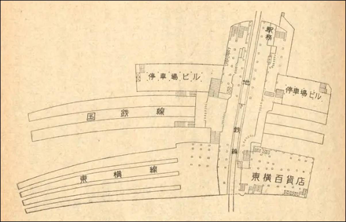 渋谷駅3階の平面図。地下鉄線(旧・東京高速鉄道線=現在の東京メトロ銀座線)の線路が渋谷駅の東側(下)から西側(上)の駅ビルに延びている。【出典:『汎交通』1958年9月号、日本交通協会】