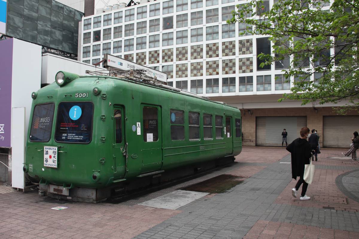 閉館直後(2020年4月)の東急百貨店東横店西館(奥)。手前に静態保存されていた東急5000系電車(初代)も再開発に伴い撤去されて秋田県大館市に移設された。【撮影:草町義和】
