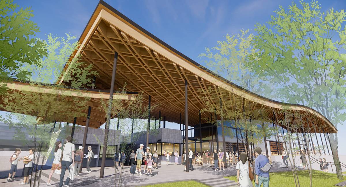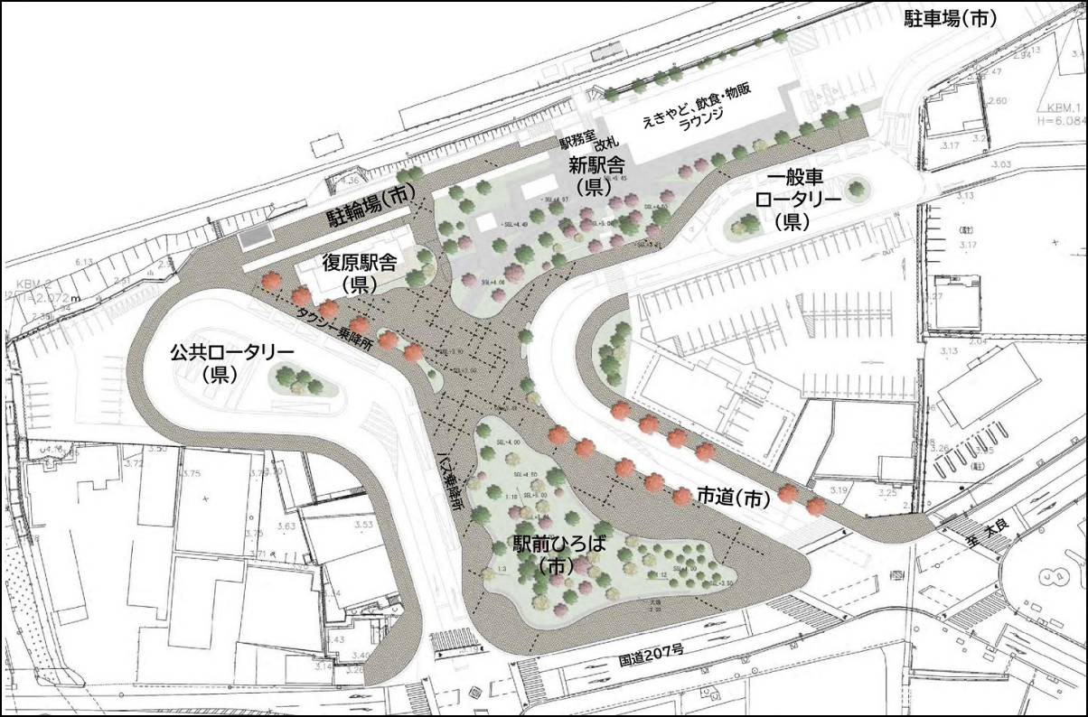 このほか、駅前に乗り入れる2本の道路を活用する形で公共交通用ロータリーと一般車用ロータリーを整備。2本の道路に挟まれた敷地はイベント開催などに対応した駅前広場として整備する。新駅舎の完成は2027年に完成の予定。2029年には周辺整備も含めすべて完成する予定だ。
