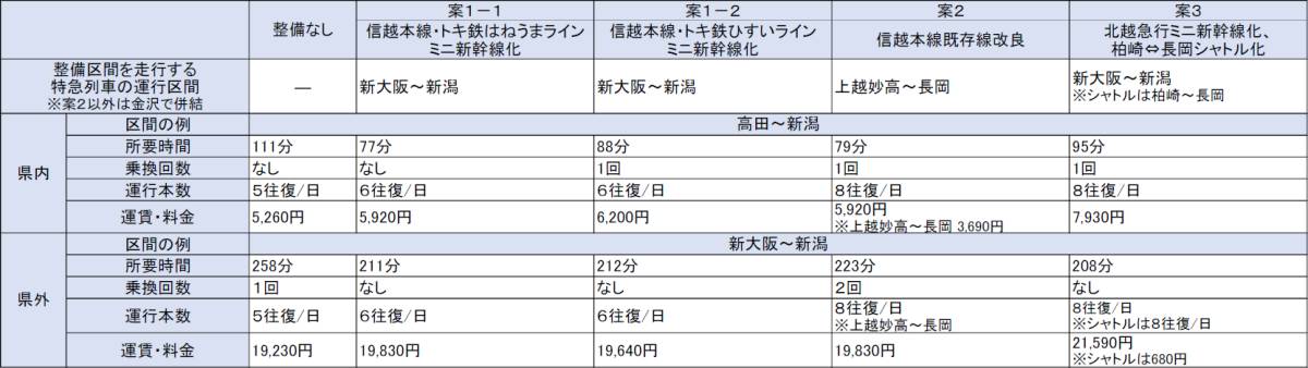暫定調査結果は8月8日、有識者や新潟県、県内各市、鉄道事業者などで構成される「高速鉄道ネットワークのあり方検討委員会」で新潟県が報告した。4案の概要は次の通り。