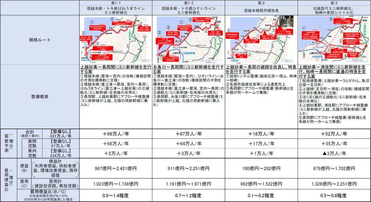 B/Cの試算も信越本線・トキ鉄はねうまラインミニ新幹線化が0.9~1.4程度で最も大きく、これに信越本線・トキ鉄ひすいラインミニ新幹線化(0.7~1.2程度)、北越急行ミニ新幹線化・柏崎~長岡シャトル化(0.5~0.8程度)が続く。最も小さいのは信越本線既存線改良(0.1~0.2程度)だった。4案とも低位予測では得られる便益が費用を下回る「1」未満だったが、高位予測では信越本線・トキ鉄のミニ新幹線化2案が「1」を超えた。