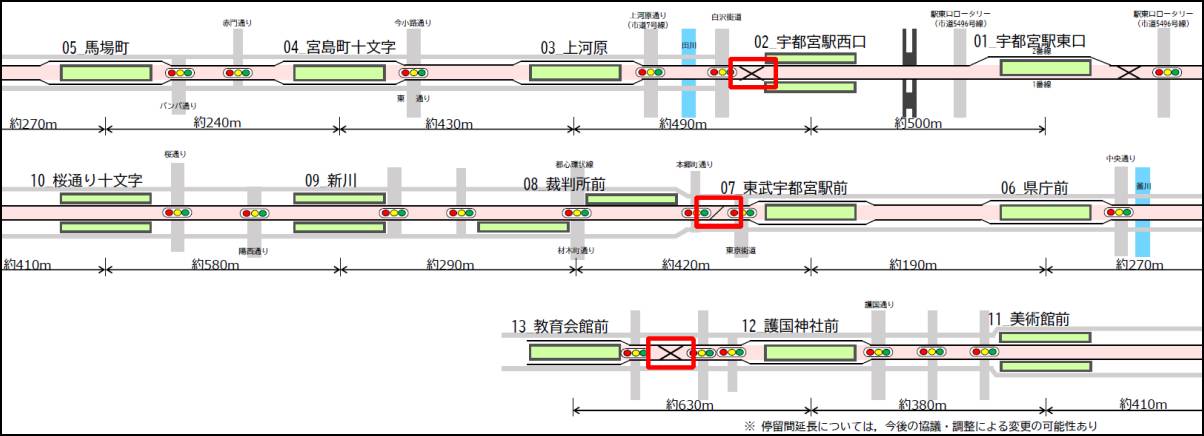 JR宇都宮駅西口停留場の教育会館前寄りと教育会館前停留場の宇都宮駅東口寄りには、折り返しに対応した両渡り線を設置。このほか、東武宇都宮駅前停留場の教育会館前寄りにも片渡り線を設置し、異常時や大通りでのイベント開催時でも残区間で運行を継続できるようにする。