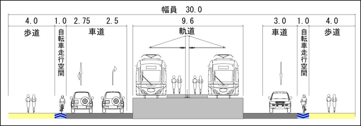 報告資料によると、西側延伸区間は宇都宮駅東口~教育会館前の4.9kmで、JR線と交差する部分を除く大半が複線の併用軌道。JR宇都宮駅西口・上河原・宮島町十文字・馬場町・県庁前・東武宇都宮駅前・裁判所前・新川・桜通り十文字・美術館前・護国神社前・教育会館前の12停留場(いずれも仮称)を新設する。