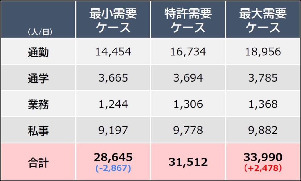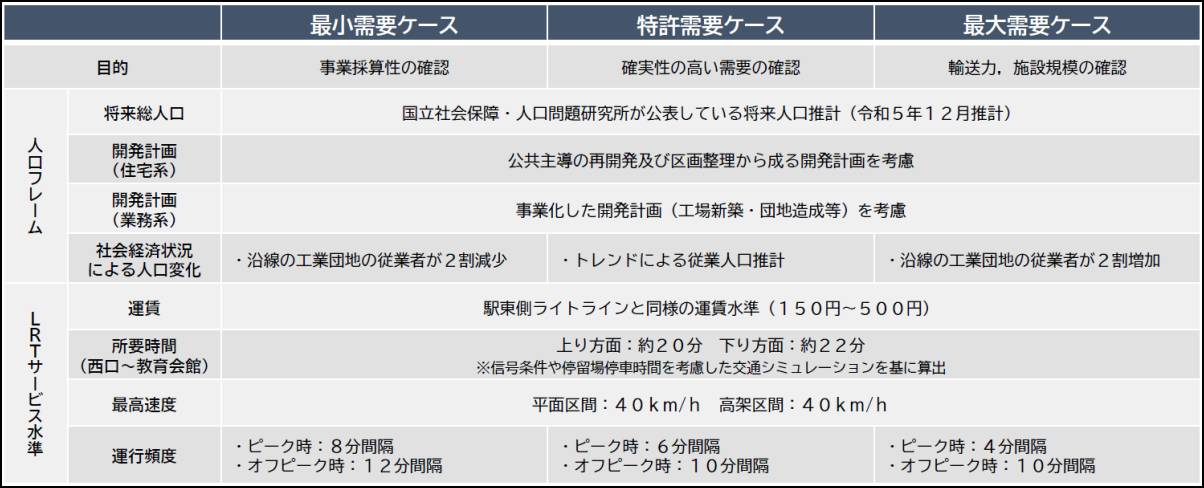需要予測は国立社会保障・人口問題研究所の将来人口推計(2023年12月)や周辺の開発計画などを踏まえて実施。運賃は東側区間と同様の水準(150~500円)とし、運行間隔などの条件を変えた「最小需要ケース(ピーク時8分、オフピーク時12分)」と「特許需要ケース(ピーク時6分、オフピーク時10分)」「最大需要ケース(ピーク時4分、オフピーク時10分)」の3ケースを調査した。特許需要ケースは軌道運送高度化実施計画(みなし軌道事業特許)の申請時に使用する中間値になる。平日1日あたりの利用者数は最小で2万8645人、最大では3万3990人で、中間は3万1512人と試算した。