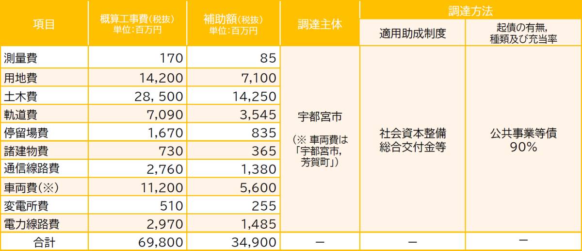 概算工事費(税抜)は精査の結果、698億円とした。このうち補助額は349億円で社会資本整備総合交付金などから拠出することを想定する。起債の種類は一般公共事業等債で充当率は90%を想定。調達主体は宇都宮市だが、車両費は芳賀町も調達主体になる。