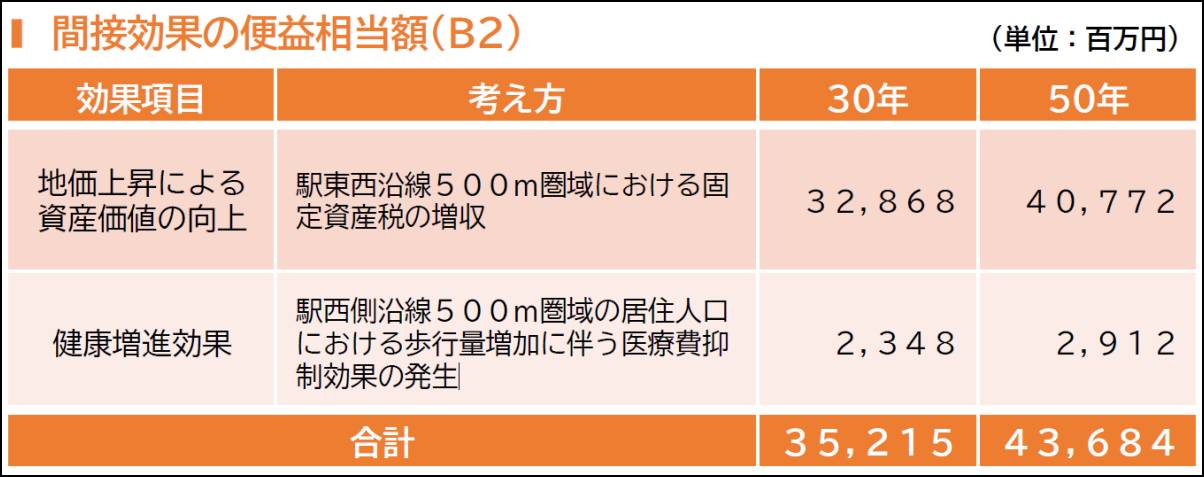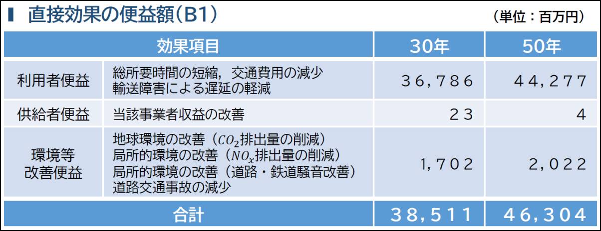 費用便益比(B/C)は開業後30年間で直接効果が0.69、間接効果が0.63相当。開業後50年間では直接効果0.83、間接効果が0.78相当と試算した。直接効果だけでは社会的効果が事業費を下回る「1」未満だが、間接効果も含めれば「1」を超える。