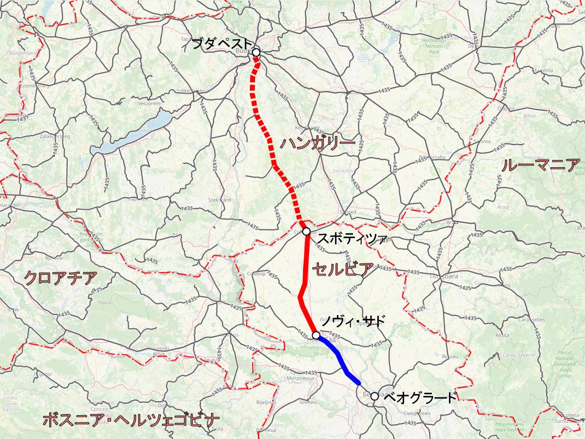 セルビア国内の約170kmの区間は、中国の広域経済圏構想「一帯一路」の一環として中国政府系銀行の融資で建設費を賄い、中国企業が建設。まずベオグラード~ノヴィ・サドの約75kmの高速化が2022年3月に完成した。続いてノヴィ・サド~スボティツァの約100kmも着工し、今年2025年10月3日に正式に開通。10月8日から定期旅客列車の営業運転も始まった。