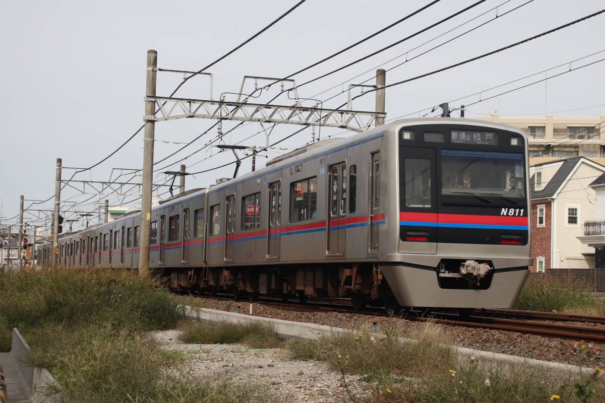 それから4分後にやってきた松戸行きはN800形のN818編成で、やっと京成色の営業列車と遭遇した。京成3000形電車とうり二つの外観に変わっており、無塗装ステンレス車体を赤・青2色の帯で装飾している。N800形はもともと3000形と共通設計のため、塗装を3000形に合わせればうり二つに見えるのは当然だが。ただ車両番号は新京成時代から変わっておらず、先頭部に記載されている車両番号の「N」の字が目立つ。