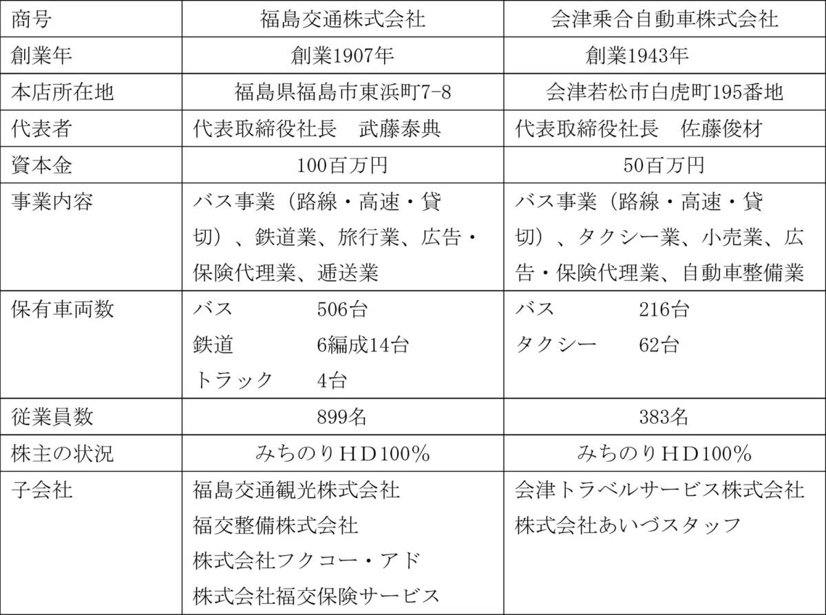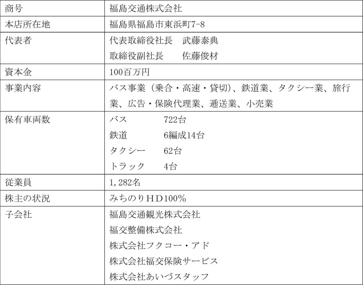 福島交通と会津バスは福島県内の公共交通会社。福島交通は鉄道(飯坂線・福島~飯坂温泉)に加え中通り地方を中心に路線バスを運行しており、会津バスは会津地方を中心に路線バスを運行している。2009年から2013年Nかけ、みちのりホールディングス(みちのりHD)が両社の全株式を取得。みちのりHD傘下の企業になった。