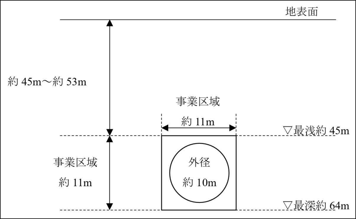 地下トンネルは外径約10mで、これを含む事業区域は幅と高さがそれぞれ約11m。最も深い場所は地下約64mになり、20階建てのビルに相当する。