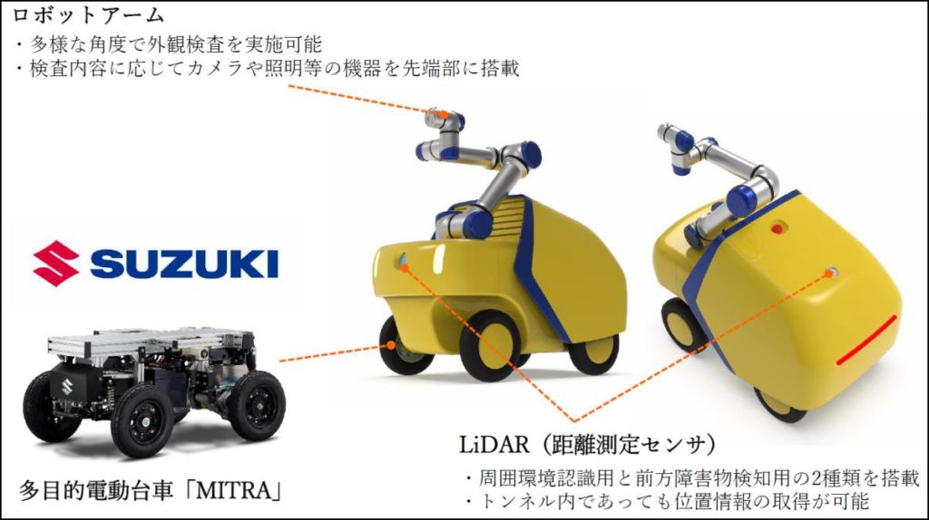 距離測定センサー(LiDAR)を搭載し、トンネル内でも位置情報の取得が可能。カメラ付きのロボットアームも設置し、さまざまな角度から外観検査を行えるようにする。また、PADが開発するソフトウェアパッケージ「@mobi」を採用し、自律移動を可能に。ロボットアーム制御機能と自動充電機能を搭載することで外観検査を自動化する。