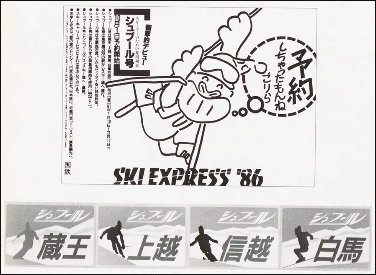 国鉄が「シュプール号」の初運行に向けて出した広告。絵入りのヘッドマークも制作された。【出典:『国鉄線』1985年10月号、交通協力会】
