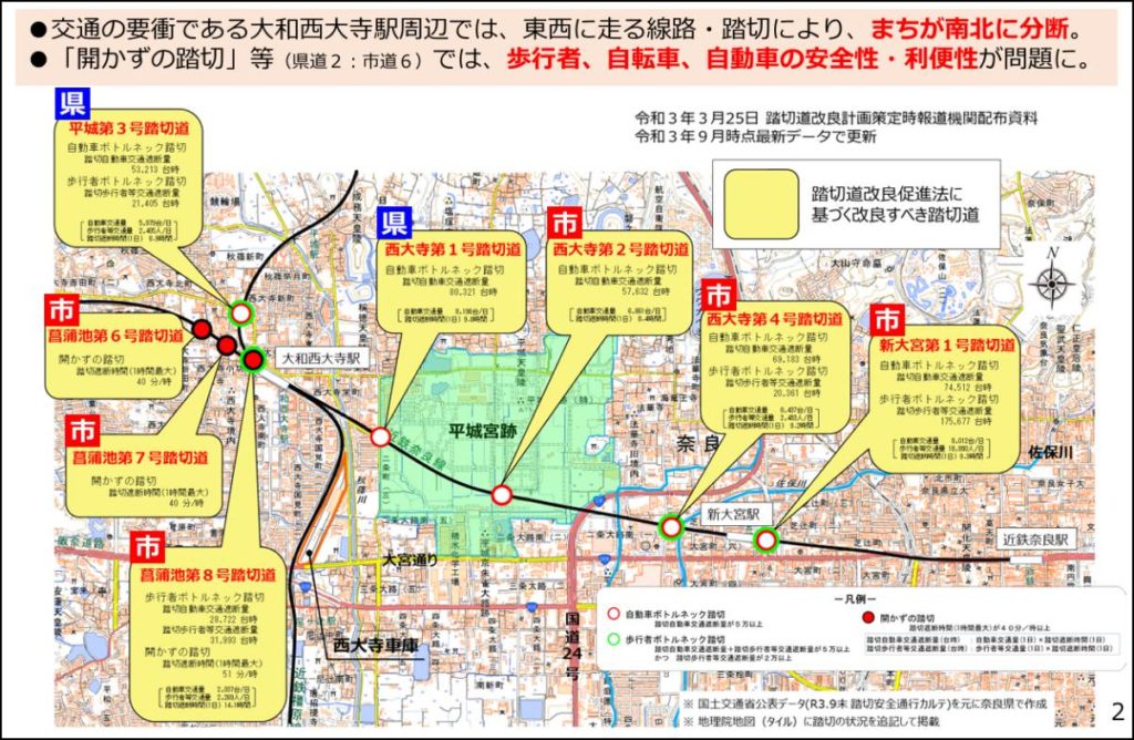 しかし奈良市は3回目の会合開催に応じておらず、議論が停滞。このため奈良県は、国の来年度2026年度の予算編成に対する最重点要望の項目から大和西大寺駅の高架化が推進を外すなど、県と市のあいだですれ違いが生じている。奈良市は膨大な費用負担を警戒しているとみられる。