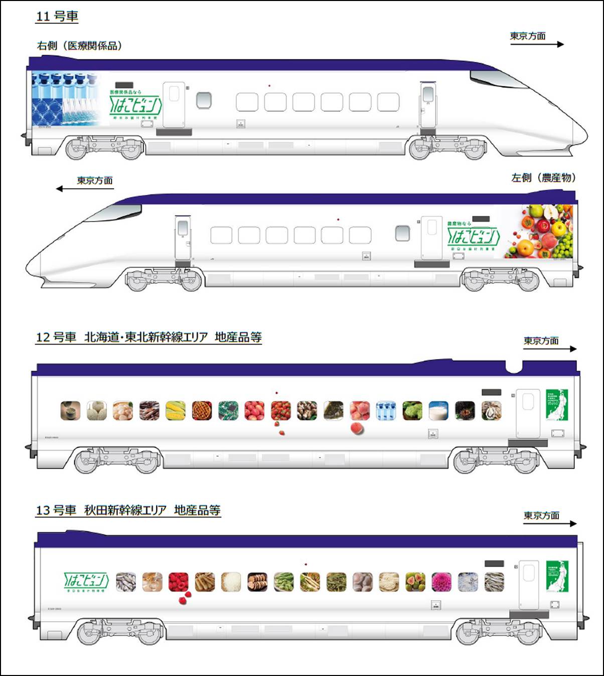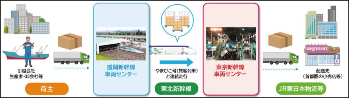 平日に定期運行を実施し、荷物の積み下ろしは車両基地で実施。E5系電車の旅客列車「やまびこ」と連結して運行する。盛岡車両センターを正午前に出発し、16時ごろには東京新幹線車両センターに到着するダイヤを想定。JR東日本は鮮度や納期が重視される商材に適した物流手段とアピールしている。