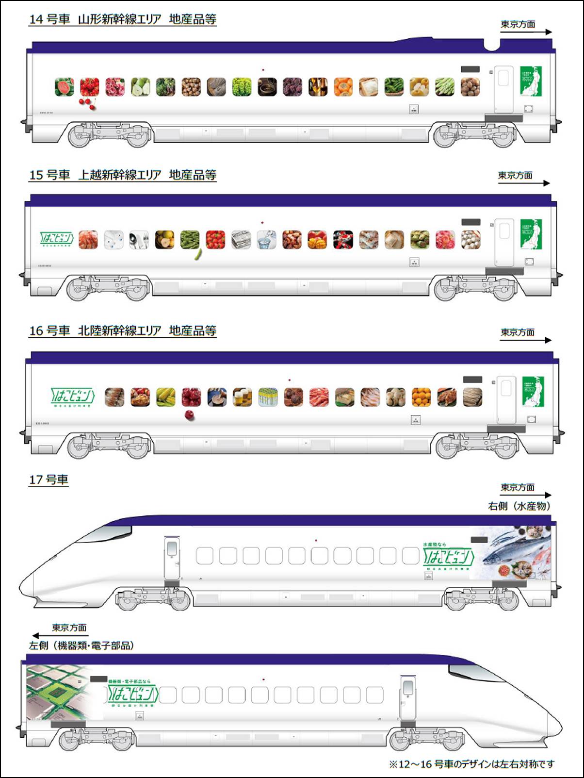 車体は荷物専用車両としての特別デザインで装飾。先頭車は代表的な輸送商材を大きく描き、中間車の窓は「はこビュン」のエリアごとで輸送実績のある地産品などをデザインする。