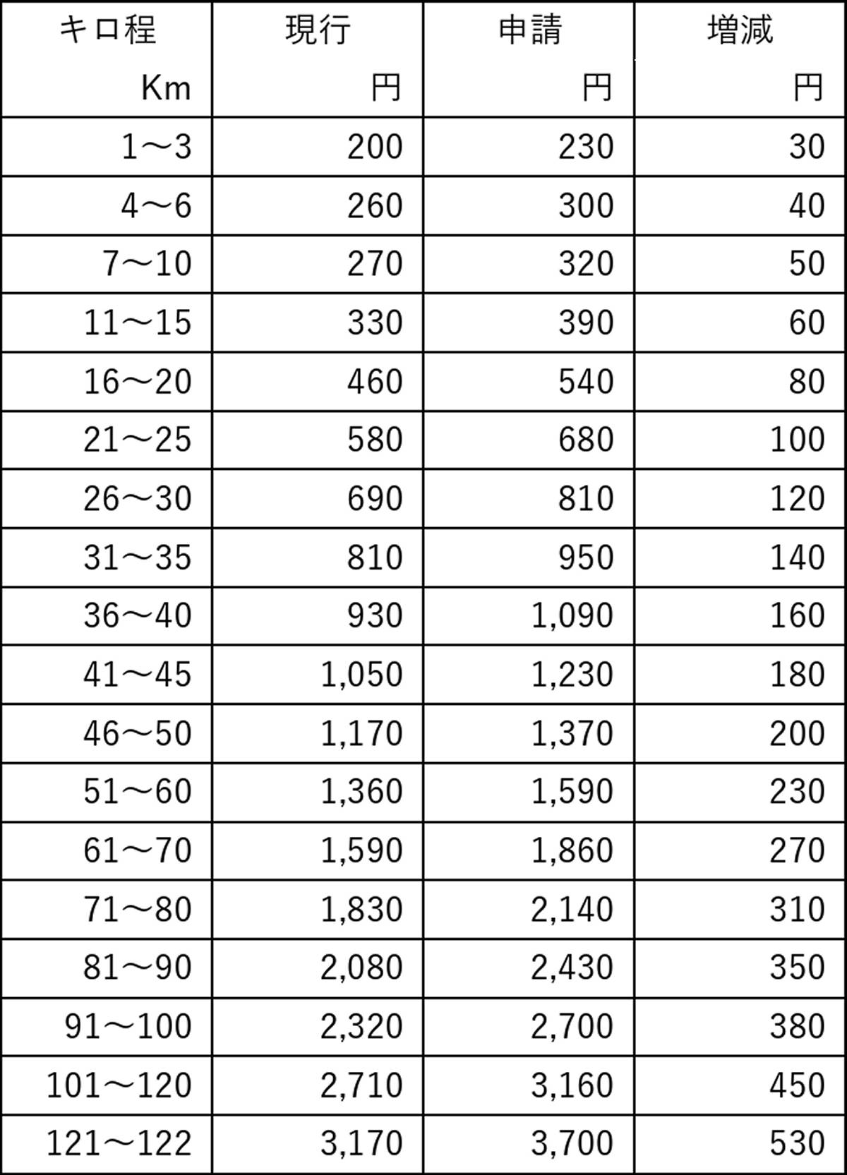 普通旅客運賃の上限は、初乗り(1~3km)が現行200円のところ30円値上げの230円。初乗り以外も各距離帯で40~530円値上げする。定期旅客運賃の上限は大人・1カ月の場合、20~25kmの区間で通勤定期が3520円値上げの2万4220円。ただし91km以上の区間は8万3500円の均一運賃とし、このうち101km以上の区間は2520~1万5580円の値下げになる。通学定期は家計負担を考慮するとして現行額を据え置く。