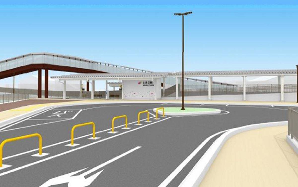 しきぶ駅はハピラインふくい線の王子保~武生に設けられる新駅。下りホームを南側、上りホームを北側に設けた千鳥配置の相対式ホームを採用する。駅の近くには紫式部公園や武生商工高校があり、1日200人以上の高校生の利用が見込まれている。