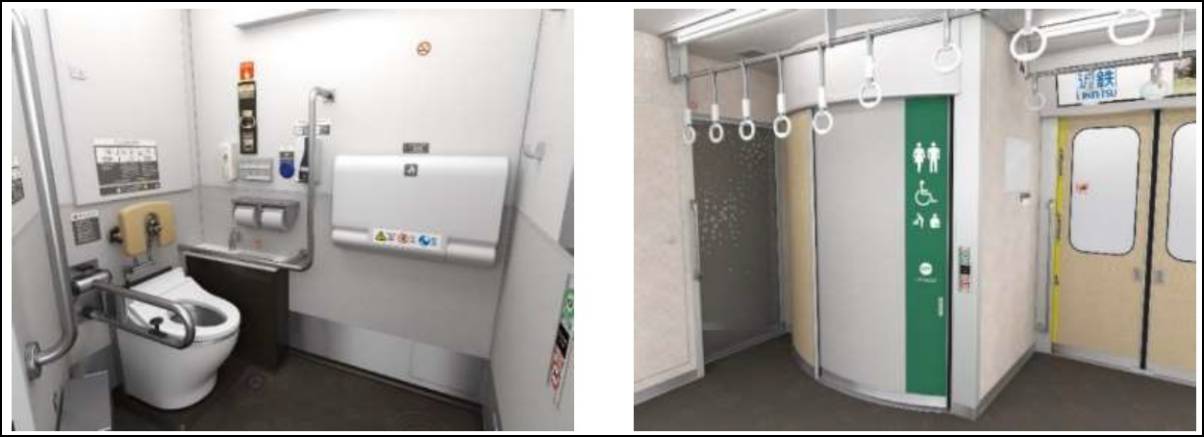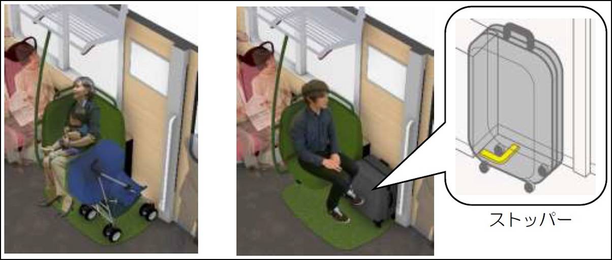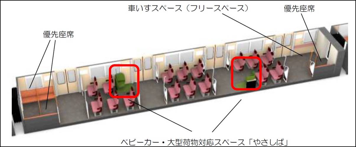 また、車椅子に対応したフリースペースを各車両に1カ所設置。ベビーカー・大型荷物対応スペース「やさしば」や長時間利用に配慮したバリアフリー対応の多目的トイレ、客が個別にドアを開閉できるスイッチを設けた。車内ドア上には大型の液晶ディスプレイを設置し、停車駅や列車の運行情報を多言語で案内するほか、広告も放送する。