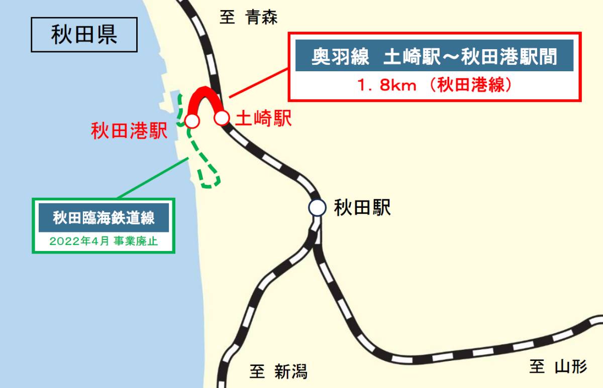 秋田港線は奥羽本線の土崎駅と秋田港駅を結ぶ1.8kmの貨物線。終点の秋田港駅で接続する秋田臨海鉄道とともに秋田港エリアの貨物輸送を担っていた。貨物列車のほか臨時の旅客列車が運行されることもあり、とくに2017年以降は秋田港に寄港するクルーズ船の乗客向けに秋田~秋田港を結ぶ臨時旅客列車がJR東日本により運行されていた。