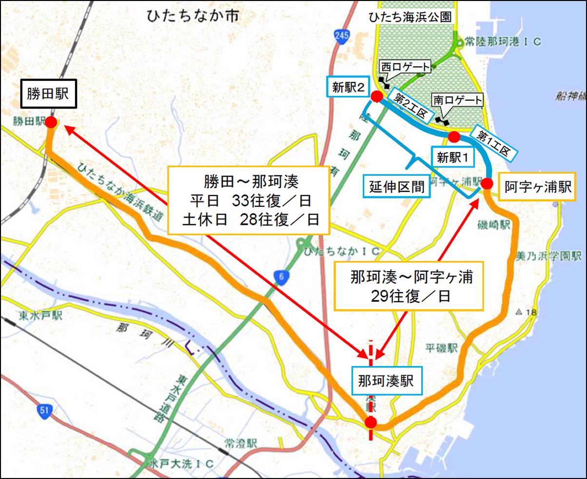 対象路線は、ひたちなか海浜鉄道が運営する湊線の勝田~那珂湊~阿字ヶ浦~新駅1(仮称)~新駅2(仮称)で17.4km。このうち阿字ヶ浦~新駅2の約3.1kmは未開業の延伸区間で、国営ひたち海浜公園へのアクセス向上を図る。新駅1駅は国営ひたち海浜公園の南口ゲート付近に整備。終点の新駅2駅は西口ゲート付近に設ける。