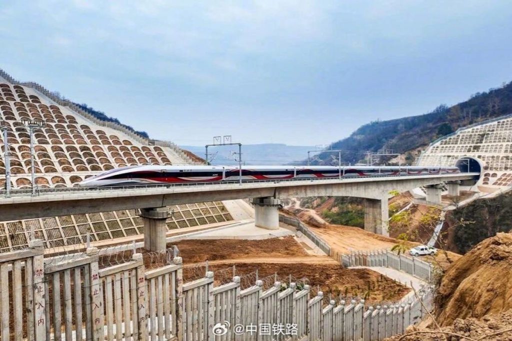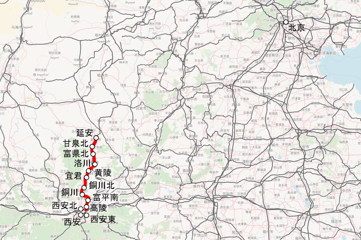 西延高速鉄道は全長約300kmで黄土高原の峡谷地帯を縦断するルート。西安東駅から高陵・富平南・銅川・銅川北・宜君・黄陵・洛川・富県北・甘泉北の各駅を経て延安駅に至る。西安東駅はまだ工事中だが、既設ターミナルの西安・西安北の各駅と西延高速鉄道を接続する連絡線が同時に開業している。最高速度は350km/hで、西安北~延安の所要時間は最短1時間8分。