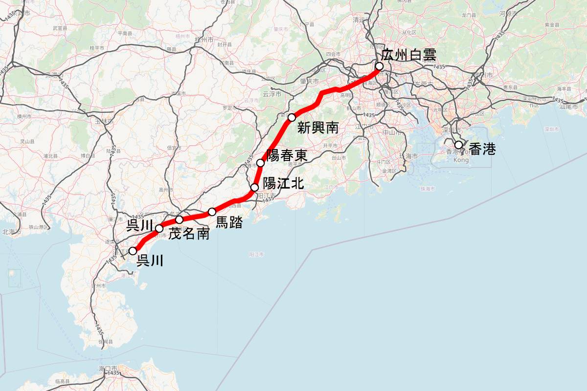 今回の開業では広州側のターミナルを既設の広州白雲駅や広州南駅とし、湛江北駅に至る。途中に新興南・陽春東・陽江北・馬踏・茂名南・呉川の6駅が設けられた。ほかに仏山駅や仏山肇慶駅、広州駅への接続線が現在建設中だ。