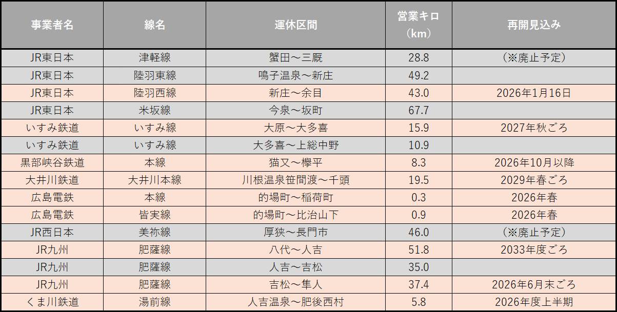 旅客運送を行っている鉄軌道事業線のうち、災害や事故、工事などで長期運休中の路線は2025年12月時点で8社12線だった。総距離は420.5kmに及ぶ。2025年12月は青森県東方沖で大きな地震が発生し、JR八戸線の高架橋が損傷。秋田内陸縦貫鉄道では脱線・転落事故が発生して長期運休のおそれもあったが、いずれも12月末までに運転を再開している。