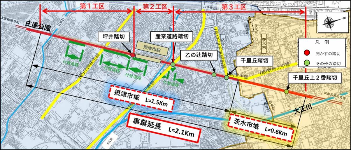 この連立事業は、摂津市庄屋1丁目~茨木市丑寅2丁目の約2.1kmを事業区間とし、摂津市駅を含む阪急京都線の線路を高架化するもの。これにより5カ所の踏切を解消する。このうち摂津市駅の大阪梅田寄りにある坪井踏切は、ピーク時間の遮断時間が1時間あたり40分以上の「開かずの踏切」だ。