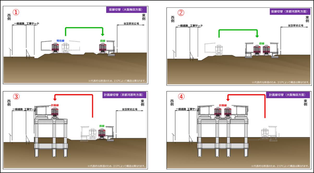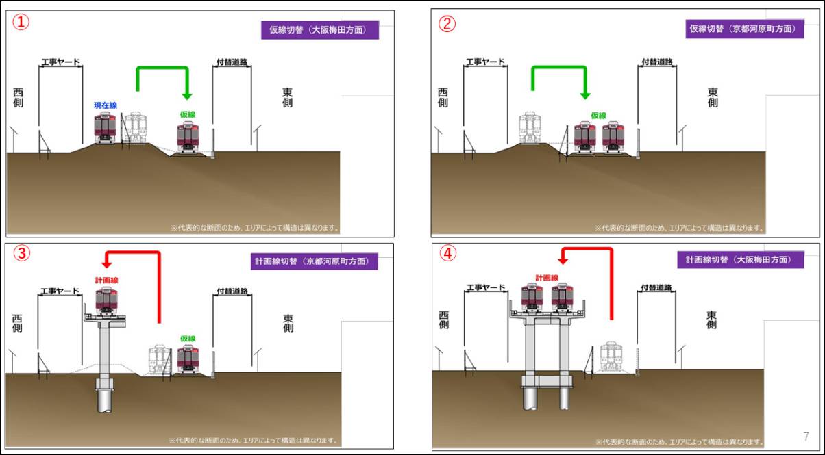 工事は三つの工区に分けて実施。工法は仮線方式を採用し、まず現在の線路を仮の線路に切り替えたうえで、現在の線路用地に高架橋を建設する。今年2025年12月時点で大阪府などが示した事業行程によると、仮線切替は2028年度以降の予定。その後、高架橋の工事に着手し、高架化後に側道を整備する。