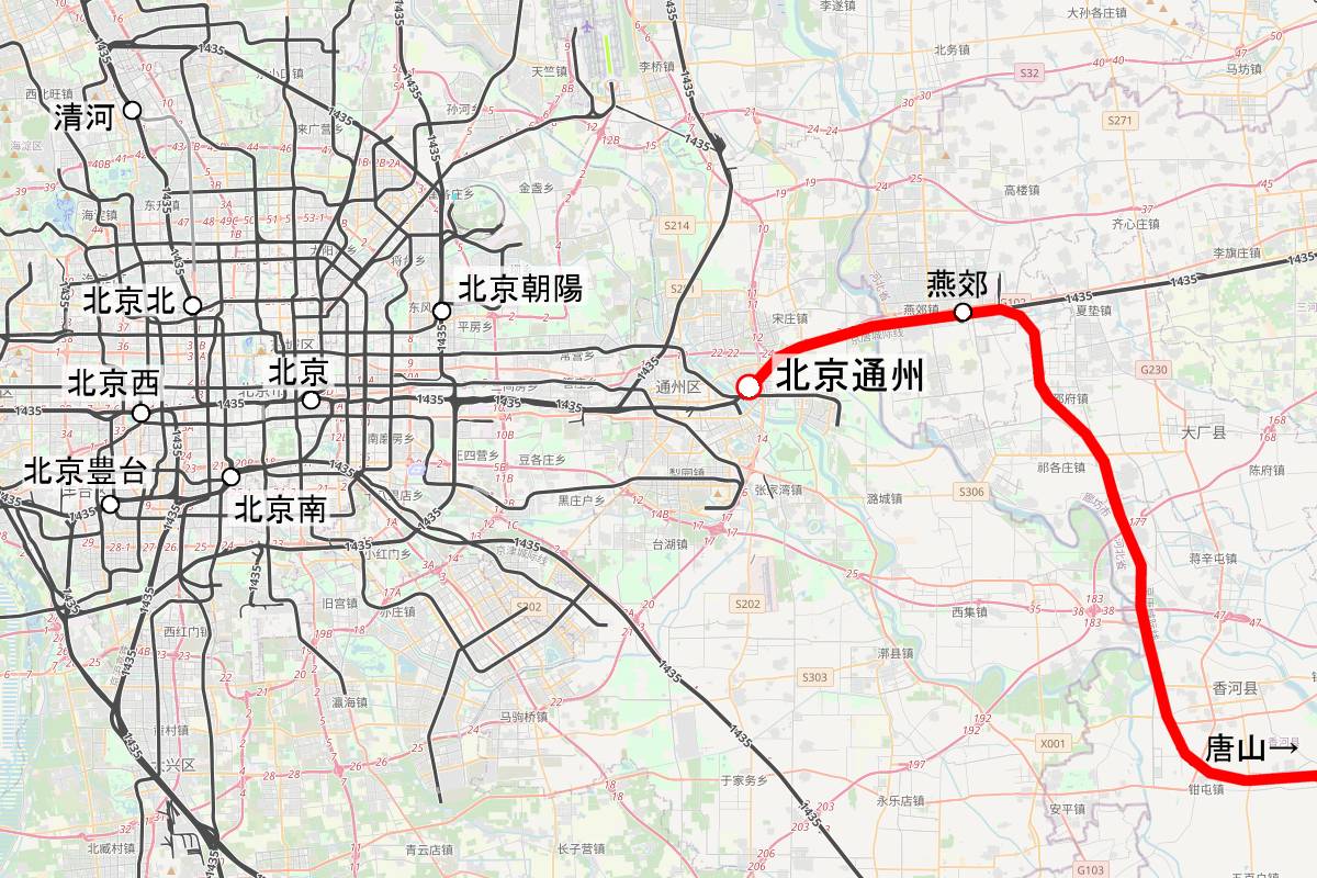 京唐都市間鉄道は北京市と河北省の唐山市を結ぶ約170kmの高速鉄道。北京通州・燕郊・大廈・香河・保地・玉田南・唐山西・唐山の8駅で構成される。最高速度は350km/hで、北京通州~唐山を最短55分で結ぶ。2022年12月に燕郊~唐山の約135kmが開業したが、北京寄りはこれまで既設の北京駅に乗り入れていた。
