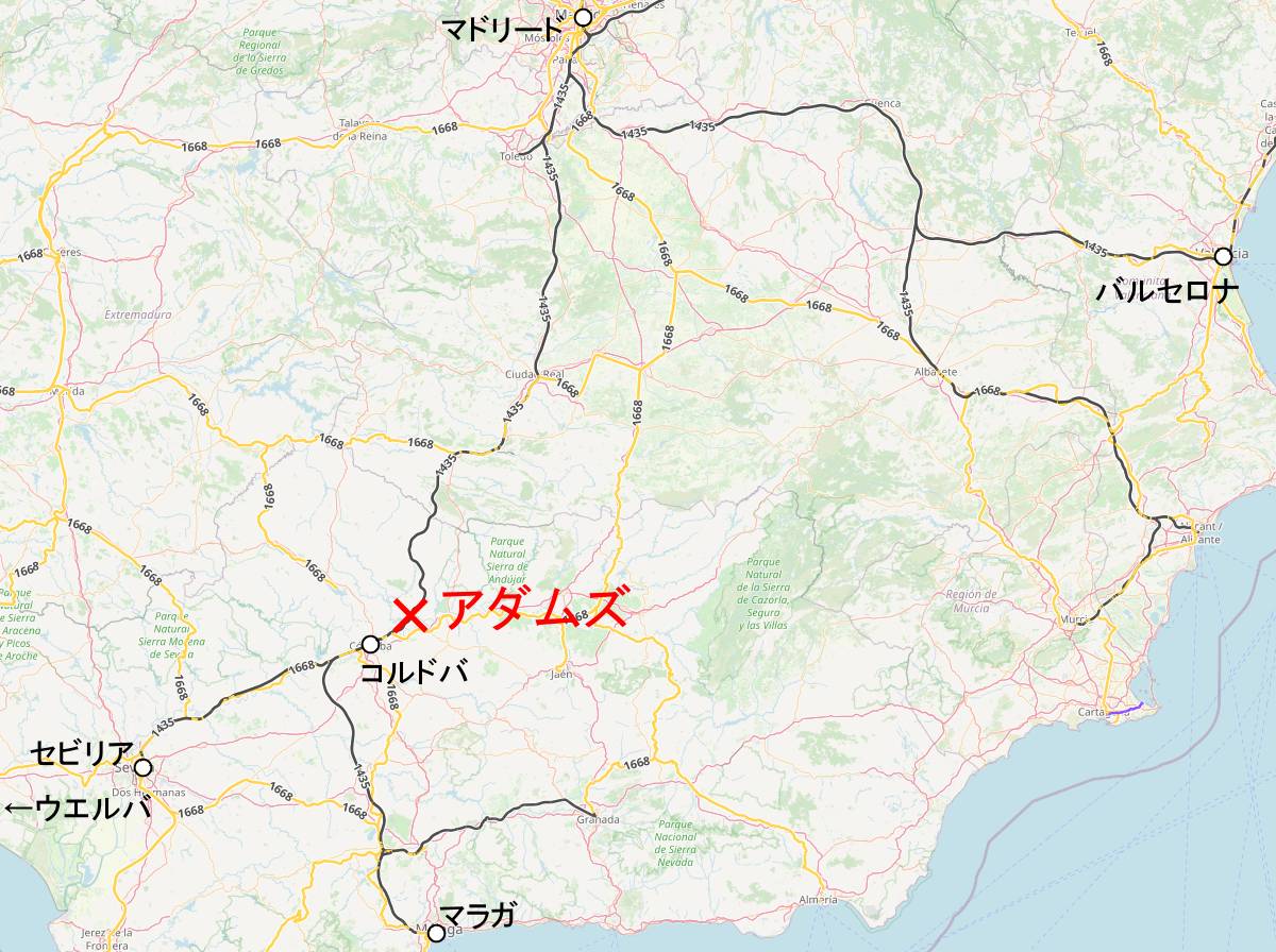 CIAFなどによると、事故は1月18日の19時45分(現地時間)に発生。マラガを18時40分に発車したマドリード行き列車(列車番号:Iryo6189)の後方2両がアダムズ(アンダルシア州コルドバ県)で脱線し、脱線した車両は隣接する線路に進入した。このとき、隣接する線路を走っていたウエルバ行き列車(列車番号:Alvia2384)がIryo6189列車の脱線車両に衝突。先頭2両が線路脇の土手下に転落した。