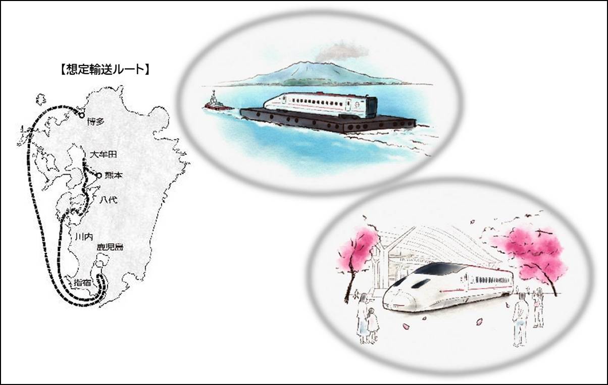 対象車両は800系電車U005編成の先頭車(1号車)。海上輸送により博多に搬入する。まず3月28日深夜から29日早朝にかけ、保管場所の熊本総合車両所から熊本新港に陸送。3月29日の日中にクレーンで車体をつり上げて台船に搭載する。熊本新港から出航する様子を見学できるイベントも行われる予定だ。