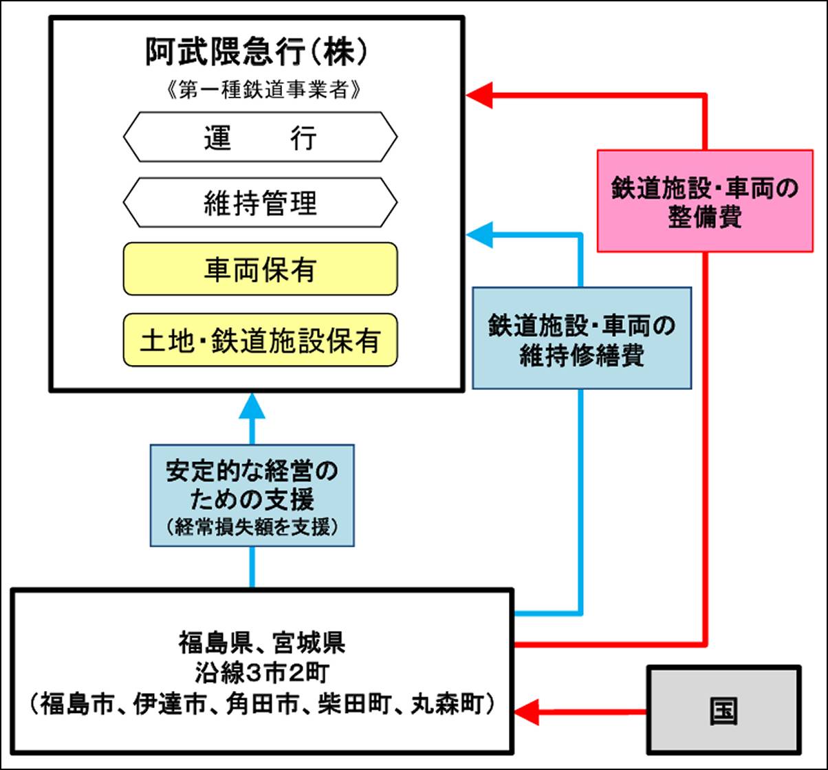実施計画の概要によると、阿武隈急行が引き続き第1種鉄道事業者として鉄道の用地・敷地を保有し、列車を運行。ただし福島県・宮城県・沿線3市2町が鉄道施設・車両の整備費と維持修繕費を負担することで実質的に上下分離方式に近い運営形態とし、経常損失額も支援する。