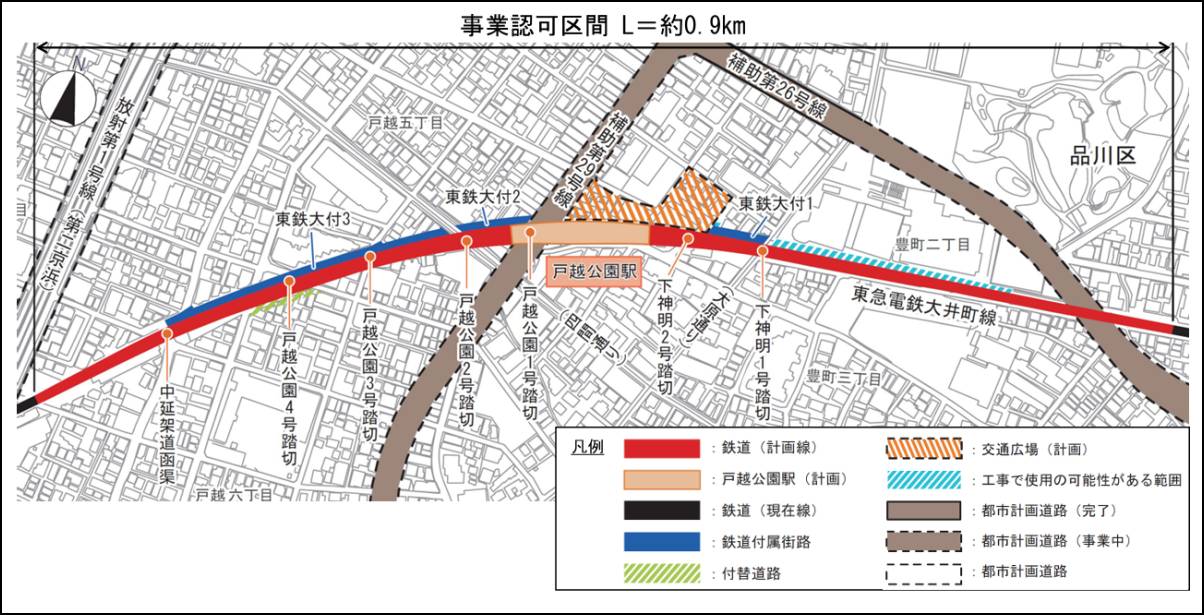 事業認可されたのは東急大井町線・品川区豊町2丁目~戸越6丁目の895m。戸越公園駅を含め線路を高架化し、6カ所の「開かずの踏切」を解消する。ほかに高架橋沿いの側道も約300m整備する。側道を含む事業費は427億円。事業施行期間は2026年2月6日~2036年3月31日。