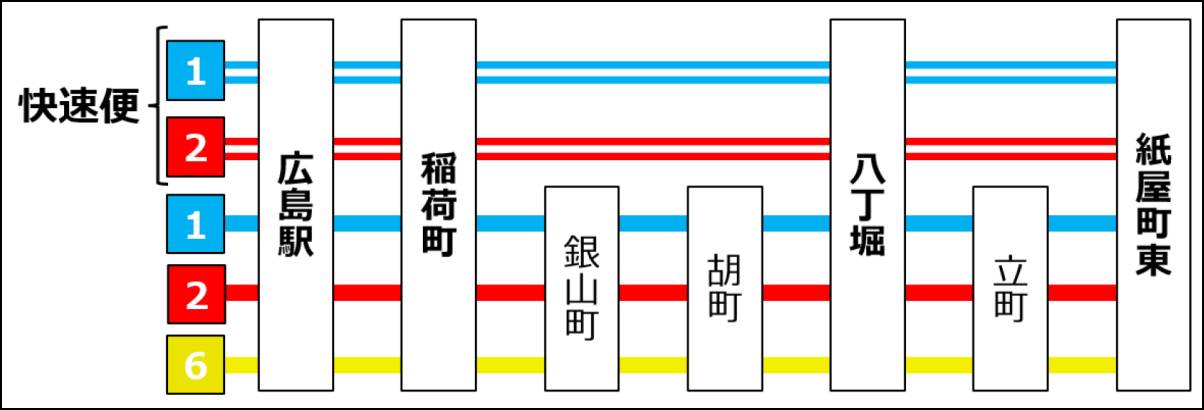 昨年2025年8月から広島駅~紙屋町東で実証運行中の快速便は、ダイヤ改正にあわせて本格運行に移行。平日朝ラッシュ時に1号線は2本(7時33分発と7時51分発)運行し、新たに2号線でも2本(7時40分発と8時03分発)運行する。快速便は銀山町・胡町・立町の各停留場を通過し、広島駅→紙屋町東を1分短い9分で結ぶ。