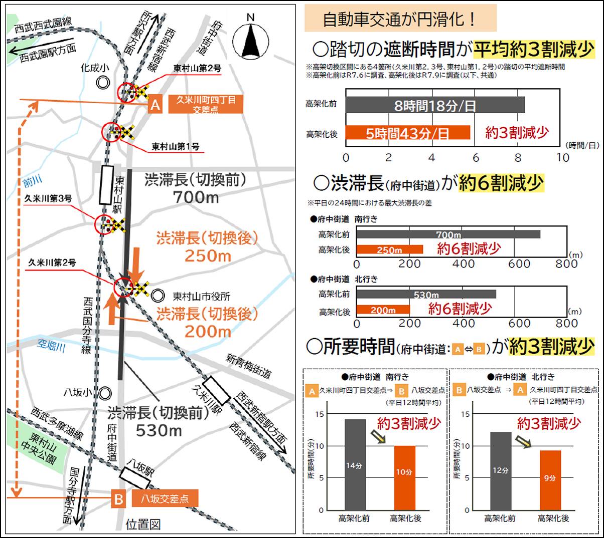 東京都と西武鉄道によると、高架切替区間にある4カ所の踏切(久米川第2・3号踏切と東村山第1・2号踏切)は1日の遮断時間が8時間18分だったが、新宿線下り線の高架化後(2025年9月)は5時間43分で遮断時間が約3割減少した。